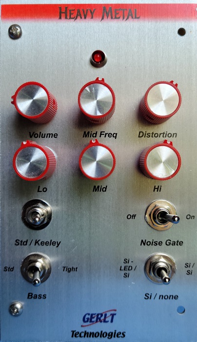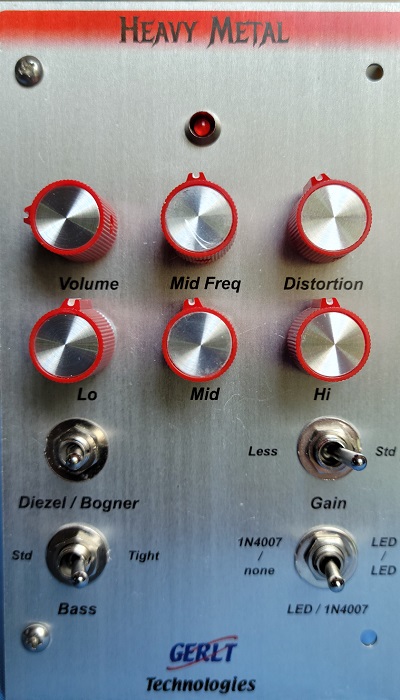 The circuit is complex, very different from other high-gain distortion designs. It took a long time for us to design our Heavy Metal, because we wanted to offer both the stock circuit's sound, along with many of the available mods. Most of the extra time spent was in researching all those different mods, figuring out what they were and what they did, and trying them out. The result is that we have a killer metal module with a dizzying array of options. It's far too much to go into the details here, so please visit the Heavy Metal page, when you have plenty of time to go through it all! Or look for it in the Distortion Modules section under Products -> Modules -> Modules By Type.