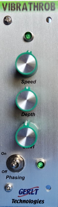 Today we announce our new VibraThrob vibrato module. But if you look closely, you'll see a switch labeled "Phasing". Toggle that switch and your vibrato becomes a 2-stage phaser. Yes, a two-fer! To turn vibrato into phaser, you add back in the original dry signal and combine it with the wet signal. The Throb knob lets you control the amount of dry signal in the phaser mix. It goes from almost no dry signal to almost all dry signal. With only two stages, you won't get the over-the-top craziness you can find with effects that have more stages. While this circuit doesn't "compare to" any commercial pedals, it is probably most similar to the MXR P-45 phaser when you turn on the phasing. Both the phaser and vibrato go from mild to chunky, medium levels of effect, with pretty much the entire range of adjustment yielding usable tones. The Speed and Depth knobs behave as you would expect.
