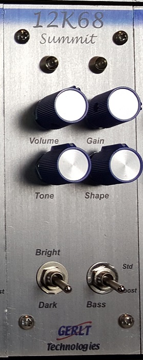 The configurations of the 12K68 module compare to pedals based on the Ed Guidry Brown Sound In a Box II (BSIAB2) design. The 12K68 Summit compares to the Wampler Pinnacle, which has much in common with the BSIAB2. The two configurations have a couple of differences. The Summit has a footswitch-controlled Boost, a modified Tone section, and a Bright/Dark switch to shift the overall range of the Tone control. They have a very similar high-gain tone, with a good range of Tone adjustment, although the Summit offers some extra tone-shaping capabilities.